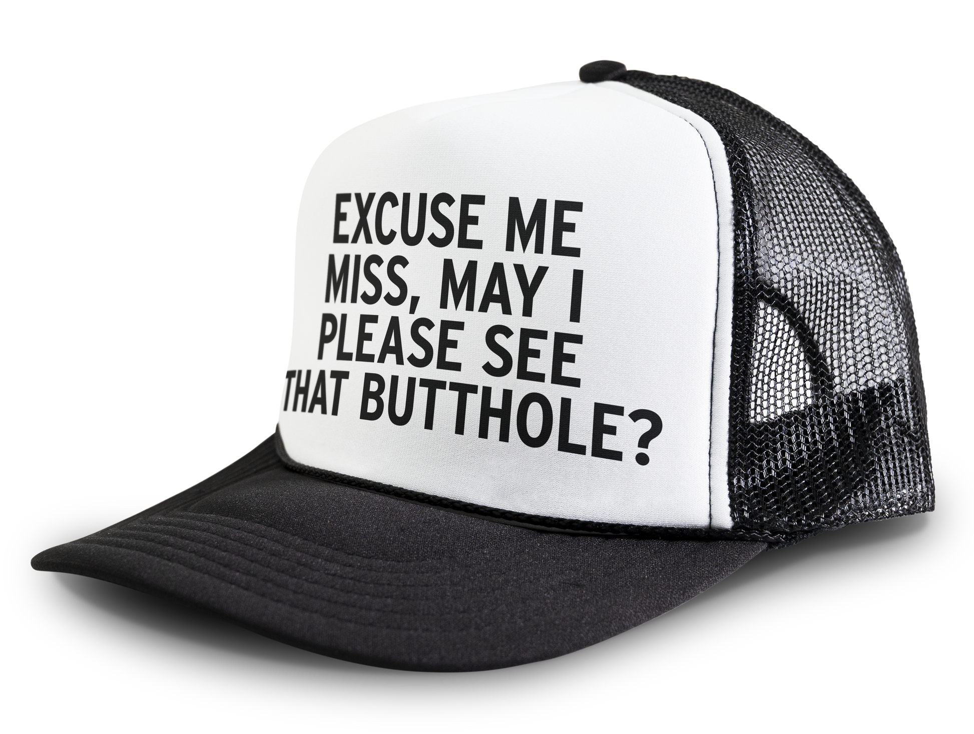 Excuse Me Miss May I Please See That Butthole Funny Party Festival Snapback Mesh Trucker Hat